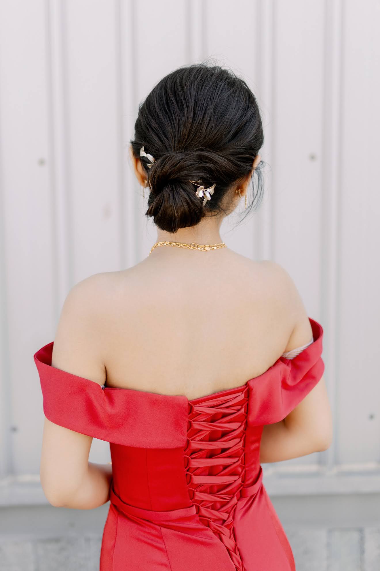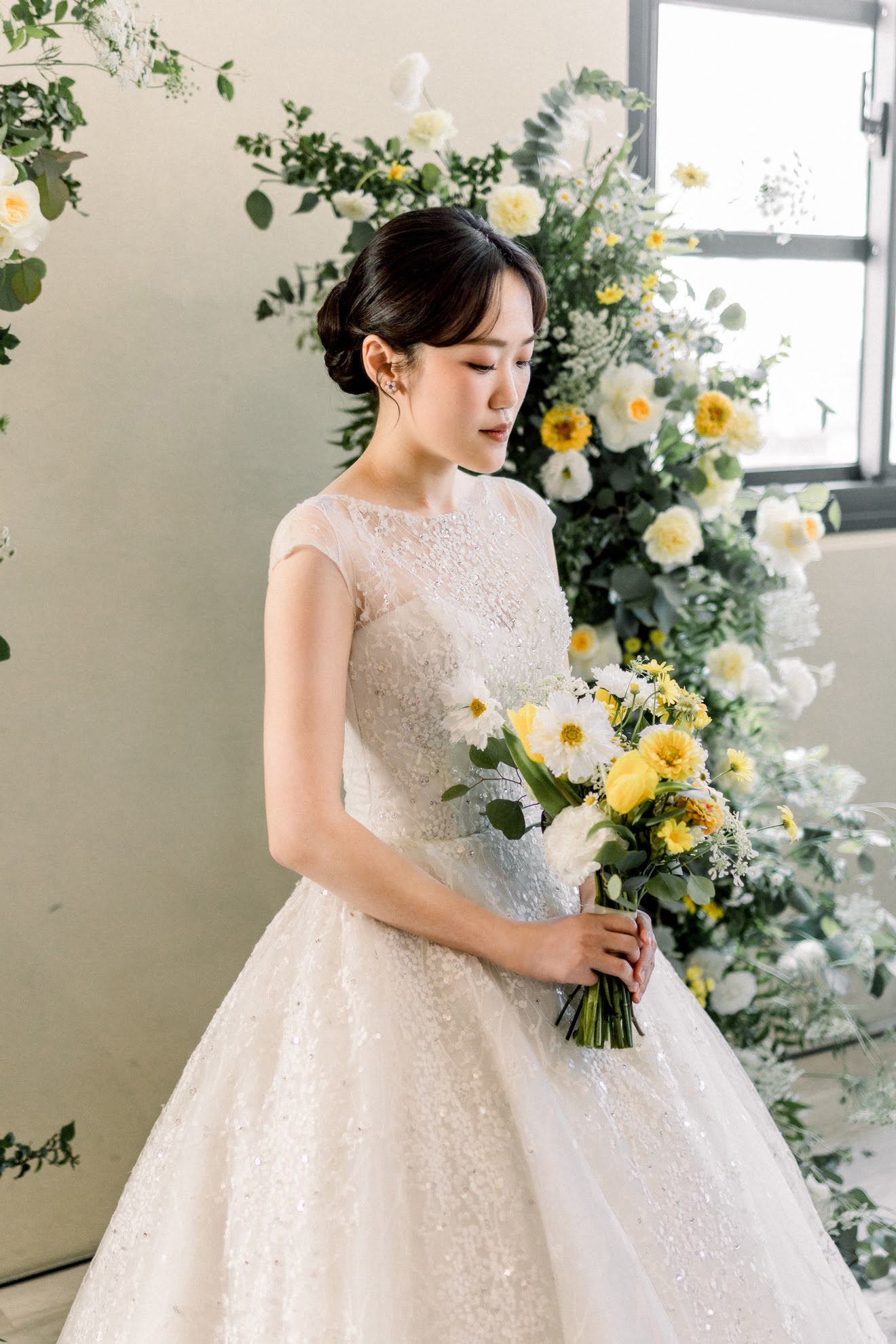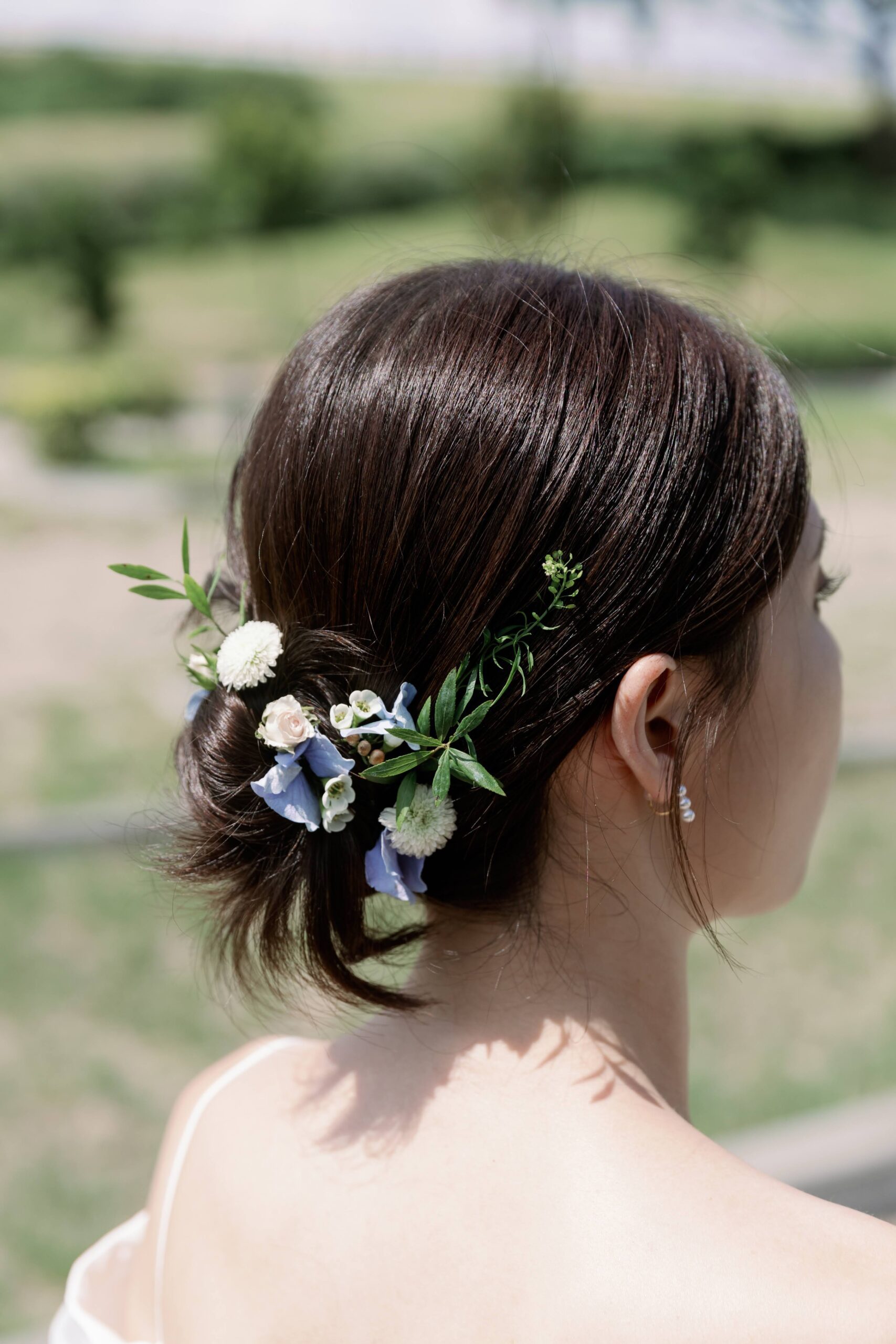 簡約的髮髻搭配細碎的小花草,